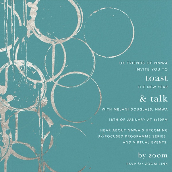 Join UK Friends NMWA and NMWA’s Melani Douglass to toast in the New Year and hear about NMWA’s virtual programme. Invitation to all current Friends and Patrons sent separately by Paperless Post. Please email Nmwa.uk@gmail.com if you have not received your invitation.